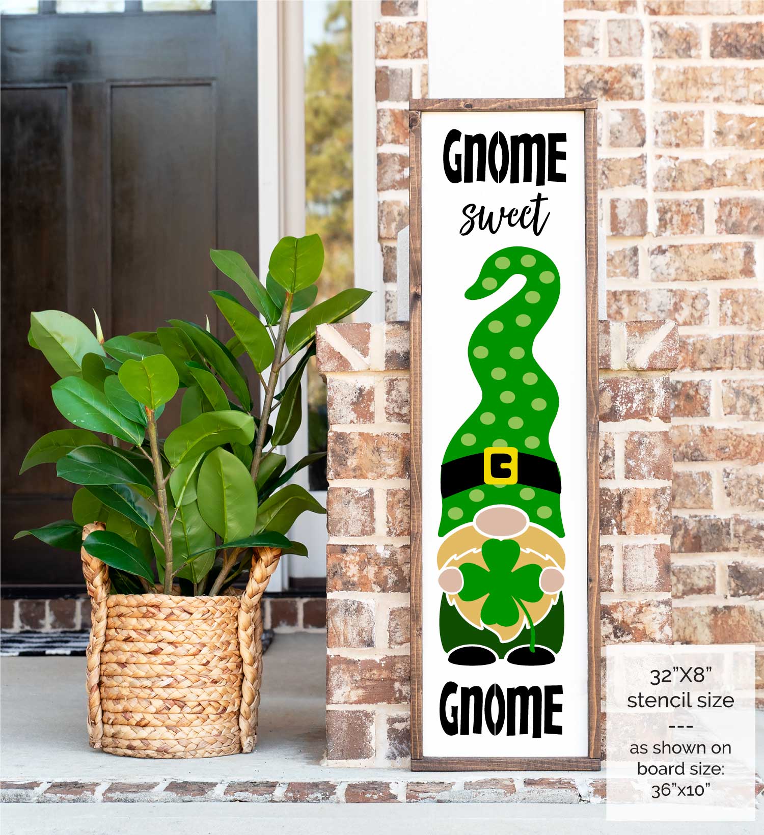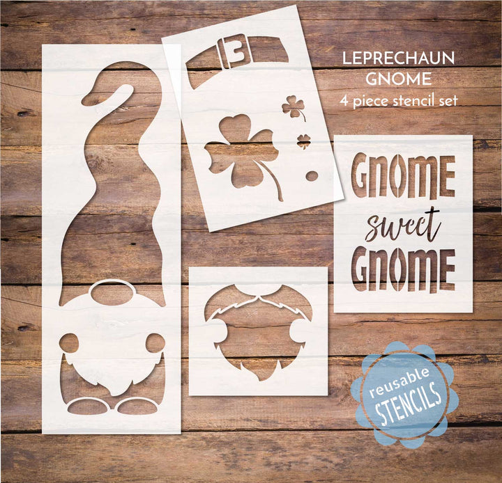 Make a cute "Gnome Sweet Gnome" sign; complete with a festive leprechaun gnome. Included are 4 stencil pieces to complete the look.