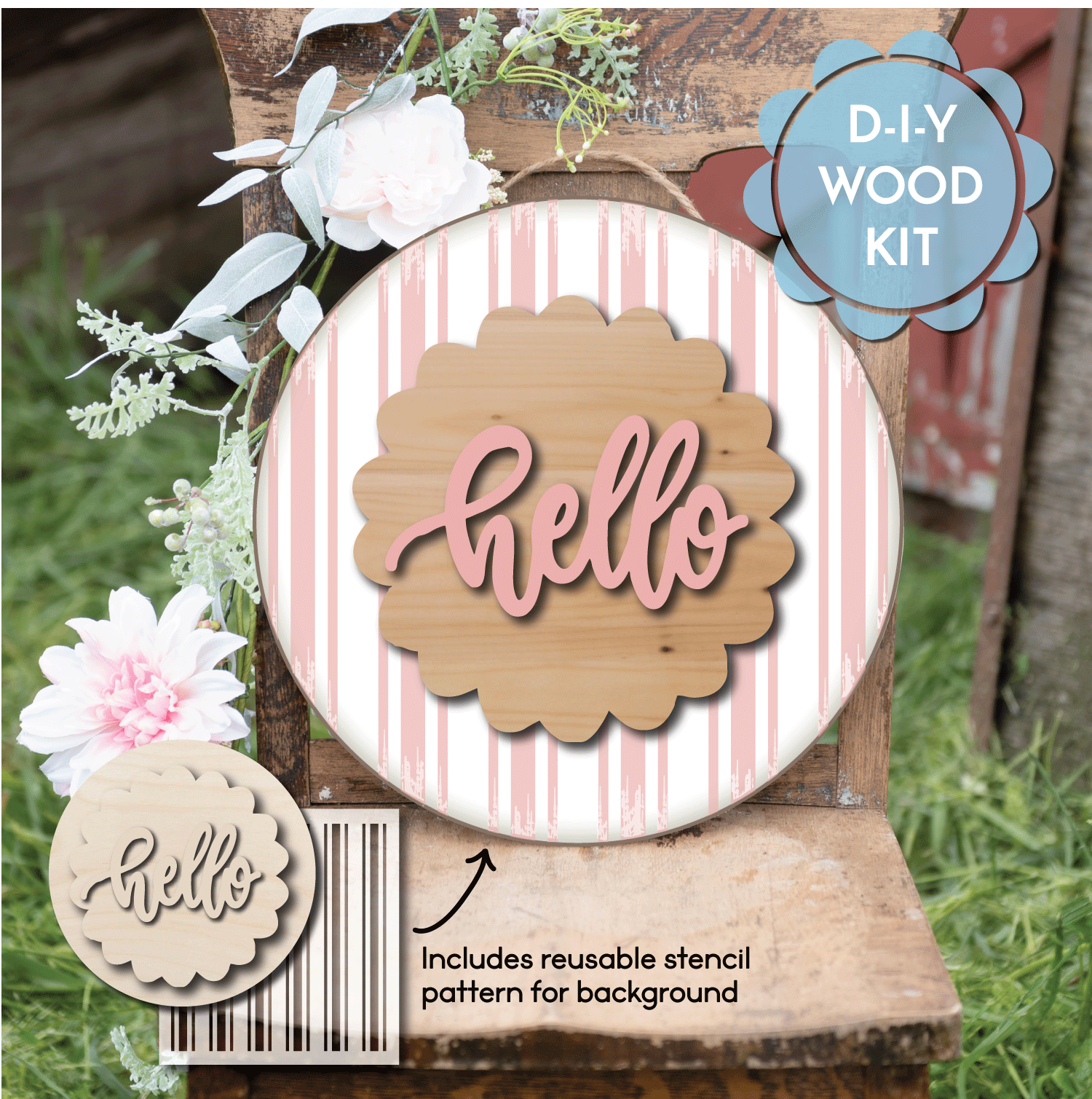 A simple but oh-so-pretty hello sign for your door! Includes base round in your choice of size; with a striped stencil pattern to match! Just paint the round a solid color and then stencil the stripes on using a good stencil brush or roller. Glue the 'hello' and scalloped circle over top (hello and scalloped round are also included). **Paint not included**