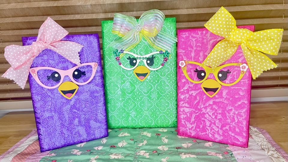 New Product! This is a set of easter chick faces cut from 1/8" MDF. Just paint the faces and glue them onto a wood block or other craft project. Super easy; no special stenciling or crafting skills required! Easy enough for kids to make. The set comes with 6 sets of faces (eyes, mouth and glasses). (paint, ribbon and blocks NOT included)