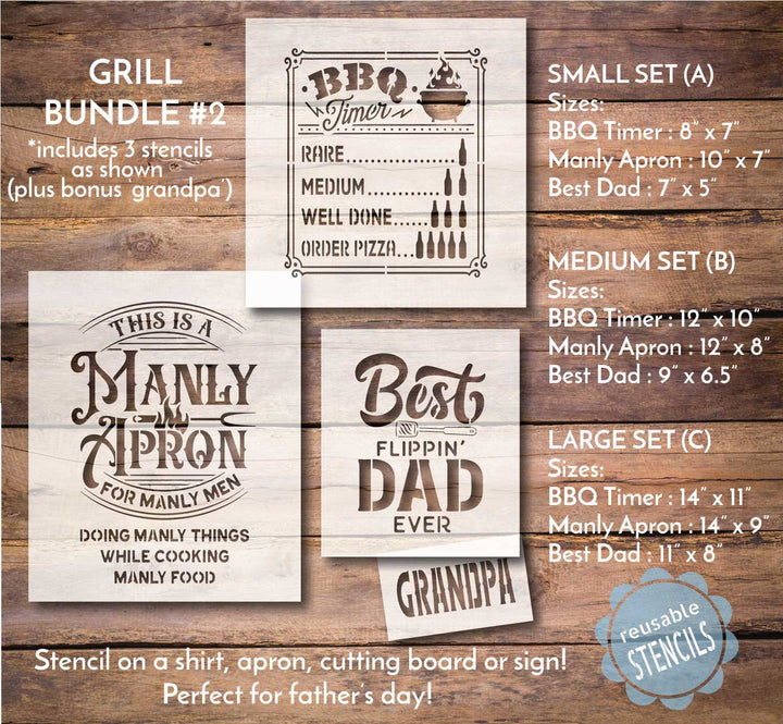 LARGE SET (C) : BBQ Timer : 14” x 11” / Manly Apron : 14” x 9” / Best Dad : 11” x 8”