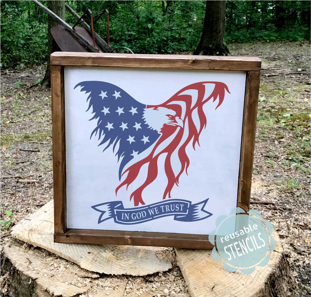 Make a patriotic sign using this reusable stencil. Use the first stencil layer to paint in the base colors (blue, red, or colors of your choice). Then when base layer is dry; overlay the second stencil to paint in the white areas such as the stars, eagle head, letters, etc.
