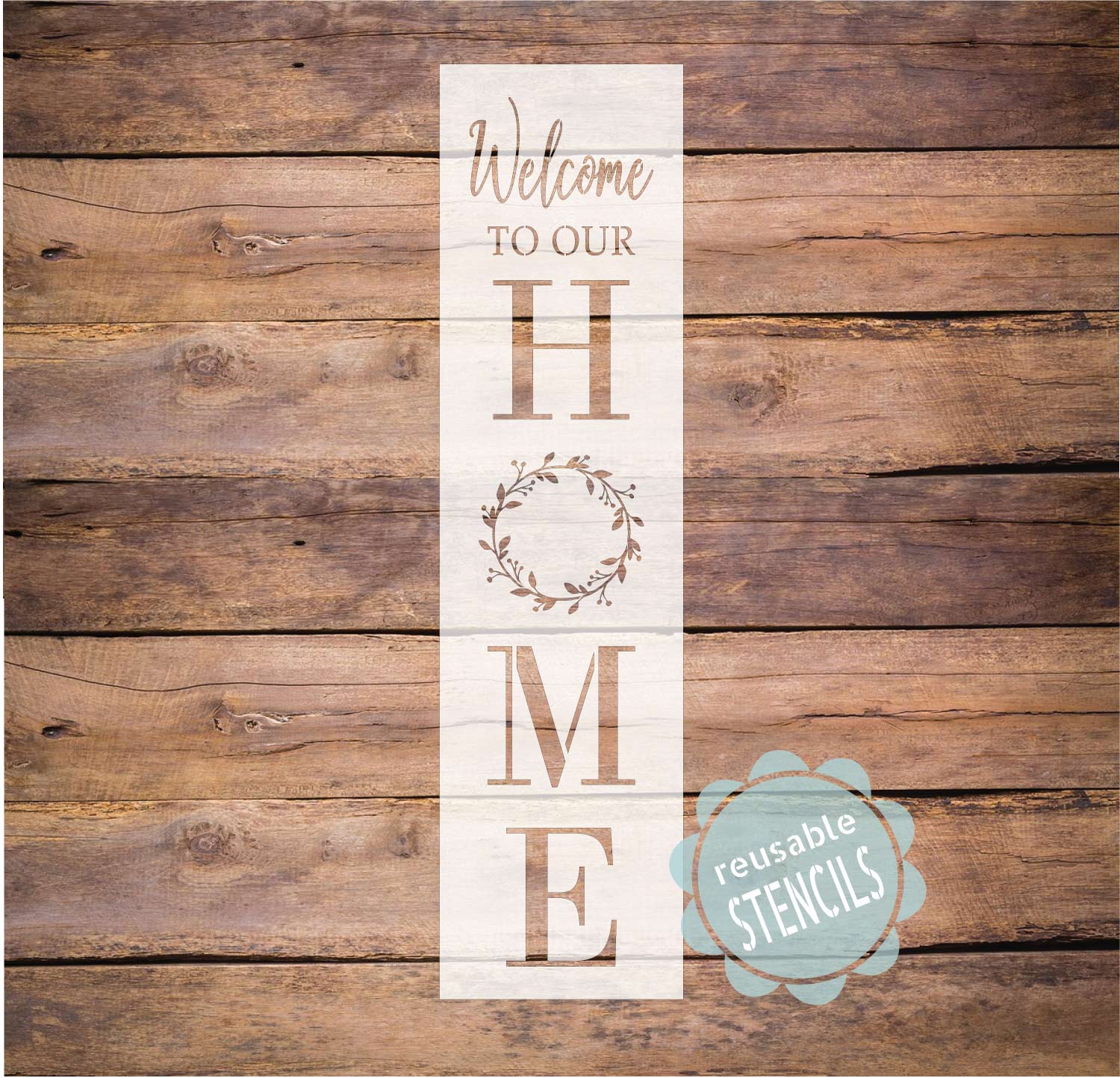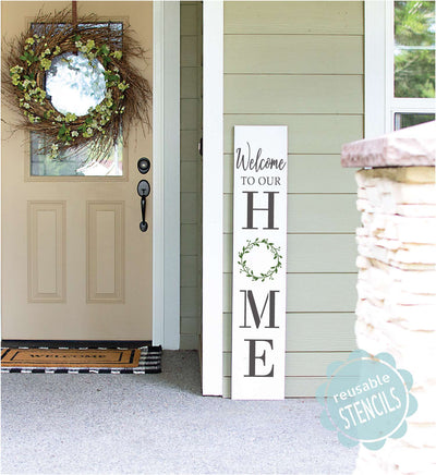 A welcoming sign for your porch with pretty wreath design! This is a reusable stencil (10mil mylar) that can be washed and reused many times!